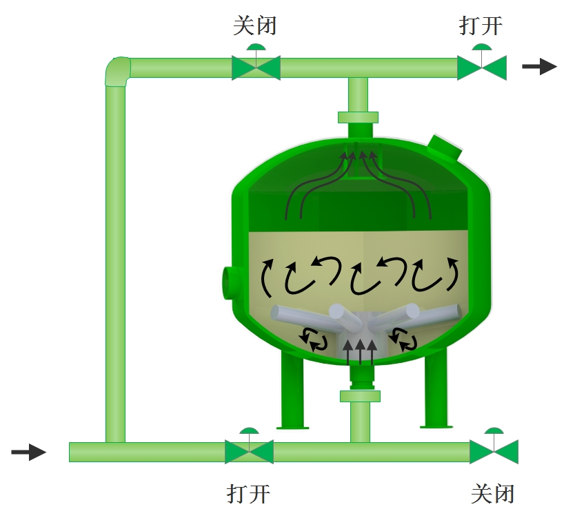 隨時雜質在濾料層中不斷聚積,壓力損失不斷增加,當壓差增加到某一設定值時或到達設定的清洗時,系統(tǒng)將自動轉換至反洗狀態(tài)。加壓水通過集水裝置進入濾料層,對其進行沖刷,使截留的污染物脫落并排出過濾系統(tǒng)。反洗持續(xù)至少2分鐘后,閥門自動將系統(tǒng)轉至過濾狀態(tài)。