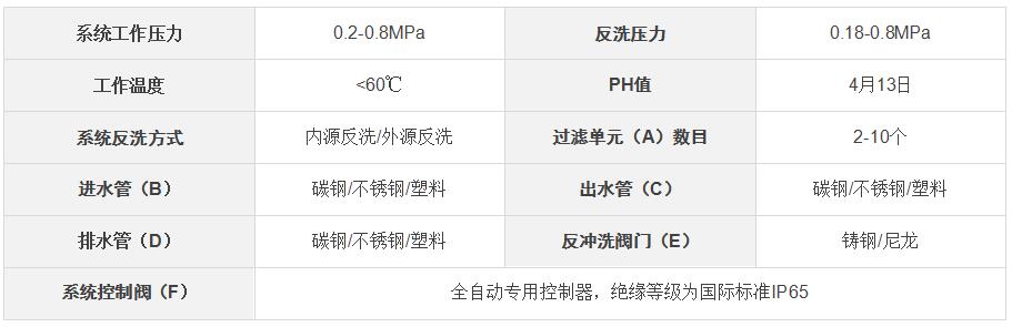系統(tǒng)工作壓力:0.2~0.8Mpa;反洗壓力:0.15~0.8Mpa