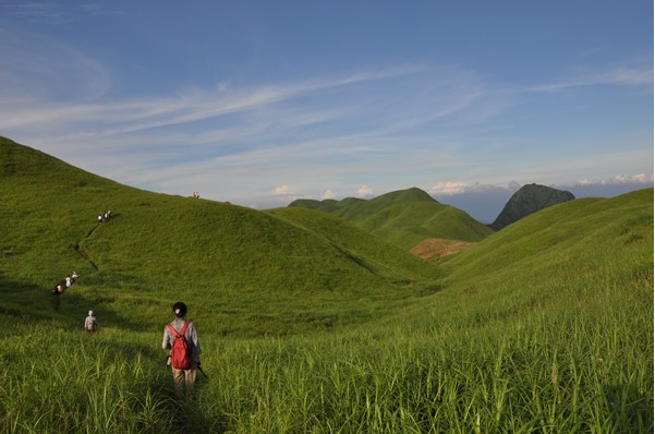 武功山的風(fēng)景很美,特別是云霧繚繞,陽(yáng)光跳躍的時(shí)候。深淺不一的草甸,輕紗薄霧繚繞的山頭。